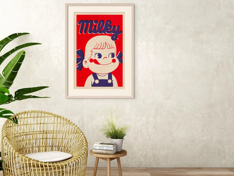 "Milky Girl" poster captura l'essència de l'art publicitari japonès de mitjan segle XX amb el seu disseny atrevit i juganer. El pòster presenta el personatge icònic de Milky Girl, representat en vibrants tons vermells i blaus profunds contra un fons ecru suau. La seva expressió alegre, amb galtes rosades i ulls brillants, evoca una sensació de joia i nostàlgia, reminiscent de la publicitat vintage.