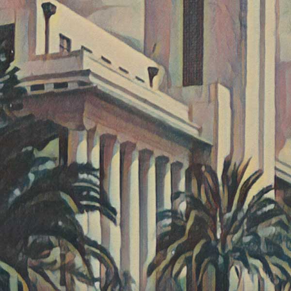 The artwork captures the grandeur of civic architecture from a time when Bulawayo was known as the “City of Kings.” From the arched portico to the clean lines of the tower rising above the canopy of palms, the design is timeless and evocative — a powerful statement piece that bridges vintage wall art with African history.