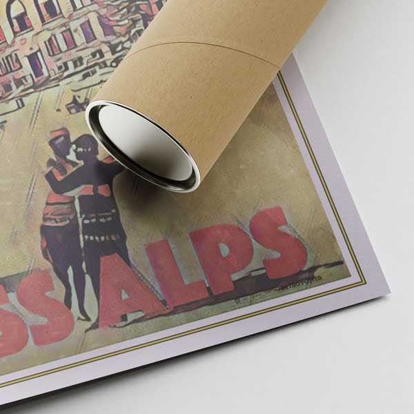 Este póster retro de los Alpes suizos es una edición original impresa a partir del archivo maestro del artista, no es una fotografía y todo el ruido, las vetas y los efectos antiguos son parte del diseño.