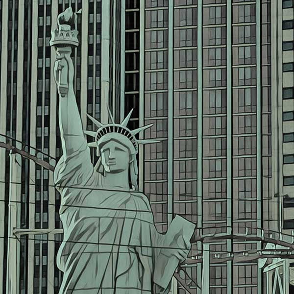 - Ämne : Denna vintage reseaffisch visar en vy över Las Vegas med hotellet och casinot New-York New York med dess frihetsgudinna i förgrunden och berg- och dalbanan samt byggnader i bakgrunden.